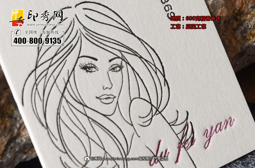 說明:600克稻香米卡是壓凹工藝的首選紙,紙張質(zhì)量厚挺硬朗。選用厚紙建議在設(shè)計(jì)上簡潔,色彩不超過3色,不然增加制作費(fèi)用。一般用色2色為佳,黑色為主色其他顏色作為點(diǎn)綴。多以些圖形或圖案作為壓凹對象。此名片節(jié)奏明快,美女美發(fā)讓人一目了然,富有朝氣個性十足。